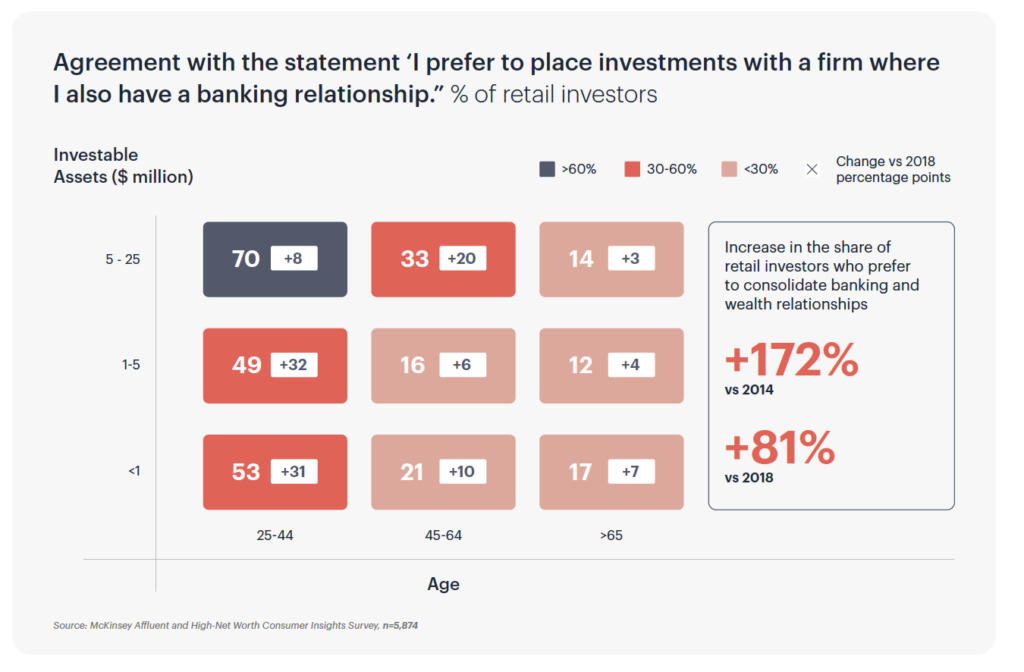 Per McKinsey’s survey, respondents aged 25 to 44 indicated a strong preference for combining their banking and investing relationships, whether they had less than $1 million or as much as $25 million across their accounts. For instance, 70% of respondents with investable assets of $5 million to $25 million wanted to invest with a firm with which they also had a banking relationship. Significant wealth wasn’t the sole determinant, though. Even the majority of those with less than $1 million of investable assets desired a singular financial relationship.